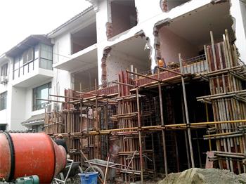 江南宅院21號別墅居住樓進(jìn)行以下施工內(nèi)容加固改造,內(nèi)容包括K軸線范圍內(nèi)的原有建筑物拆除(包括局部陽臺、雨篷、衛(wèi)生間、車庫、樓梯、儲藏室、原有臥室、院內(nèi)天井建筑物等);對現(xiàn)有客廳及臥室一至二層進(jìn)行樓板頂升支撐;對該結(jié)構(gòu)改造加固住宅樓四周進(jìn)行安全防護(hù)架搭設(shè);對原住宅樓底層承重墻及過梁(圈梁)進(jìn)行臨時頂升支撐,并同時托換成鋼筋混凝土柱、剪力墻、底框梁等;對部分磚混基礎(chǔ)進(jìn)行混凝土加固;K軸范圍內(nèi)的土建工程;新建保安門衛(wèi)室、大門等土建工程;新建第11軸擴(kuò)建門廳土建工程;對原外墻體進(jìn)行保溫施工;對外墻面進(jìn)行外裝氟碳漆涂料施工;對施工過程中破壞的室外地平進(jìn)行恢復(fù)(包含零星項(xiàng)目)施工; 附現(xiàn)場施工作業(yè)照片